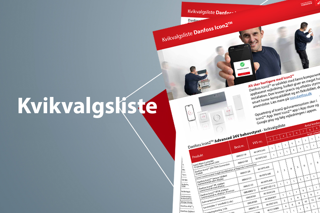 Med nogle få, enkle trin kan du nemt angive de nøjagtige koder, du skal bruge til dit næste gulvvarmeprojekt. Du kan enten benytte for Icon2™ konfigurator eller vores kvikvalgsliste.