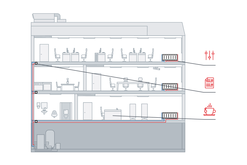 In den meisten Fällen als 2-Rohrsystem mit einem oder mehreren Heizkörpern in jedem Raum konzipiert. Zur Regelung der Raumtemperatur werden Heizkörperthermostate von Danfoss verwendet. Diese bestehen aus einem Heizkörper-Thermostatventil, meist mit einer Voreinstellung des Nenndurchflusses, und einem Temperaturfühler. Eine Vielzahl von Sensoren sorgt für eine genaue Regelung der Raumtemperatur. Wenn beispielsweise Vorhänge eine korrekte Messung der Raumtemperatur verhindern, ist eine Version mit Fernfühler oder Fernfühler und Regelung eine bessere Option.