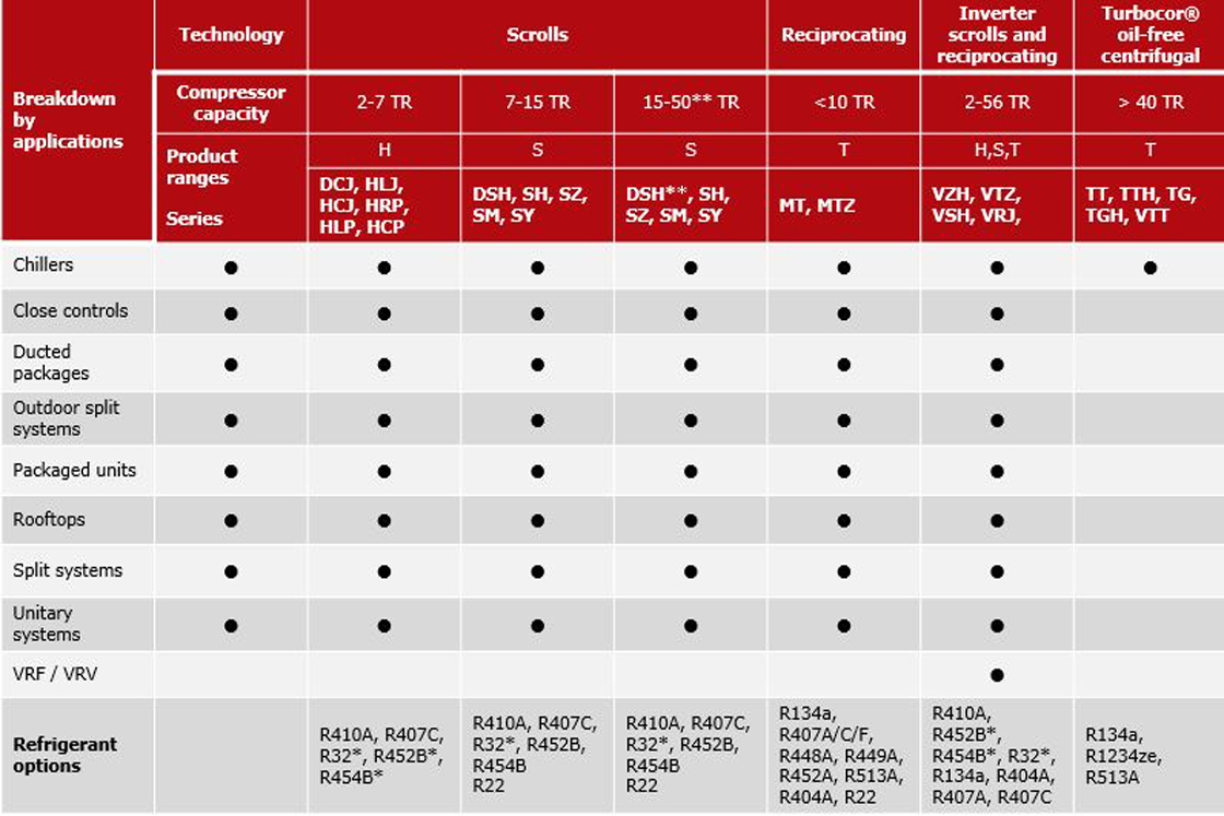 Vielseitigkeit, Flexibilität und Effizienz der Danfoss Verdichter für Klimaanwendungen sorgen für wettbewerbsfähige Entwurfskosten und kürzere Entwicklungszeiten für HLK-Anlagen von 8,8 KW bis 1,22 MW (2,5 bis 350 Tr.) Dieses Angebot umfasst die wegweisenden ölfreien Danfoss Turbocor-Zentrifugalverdichter sowie Scrollverdichter mit Zwischendruckventilen (IDVs), die die Teillasteffizienz optimieren, rückwärtskompatibel sind und die Kosten für Neukonstruktionen minimieren.