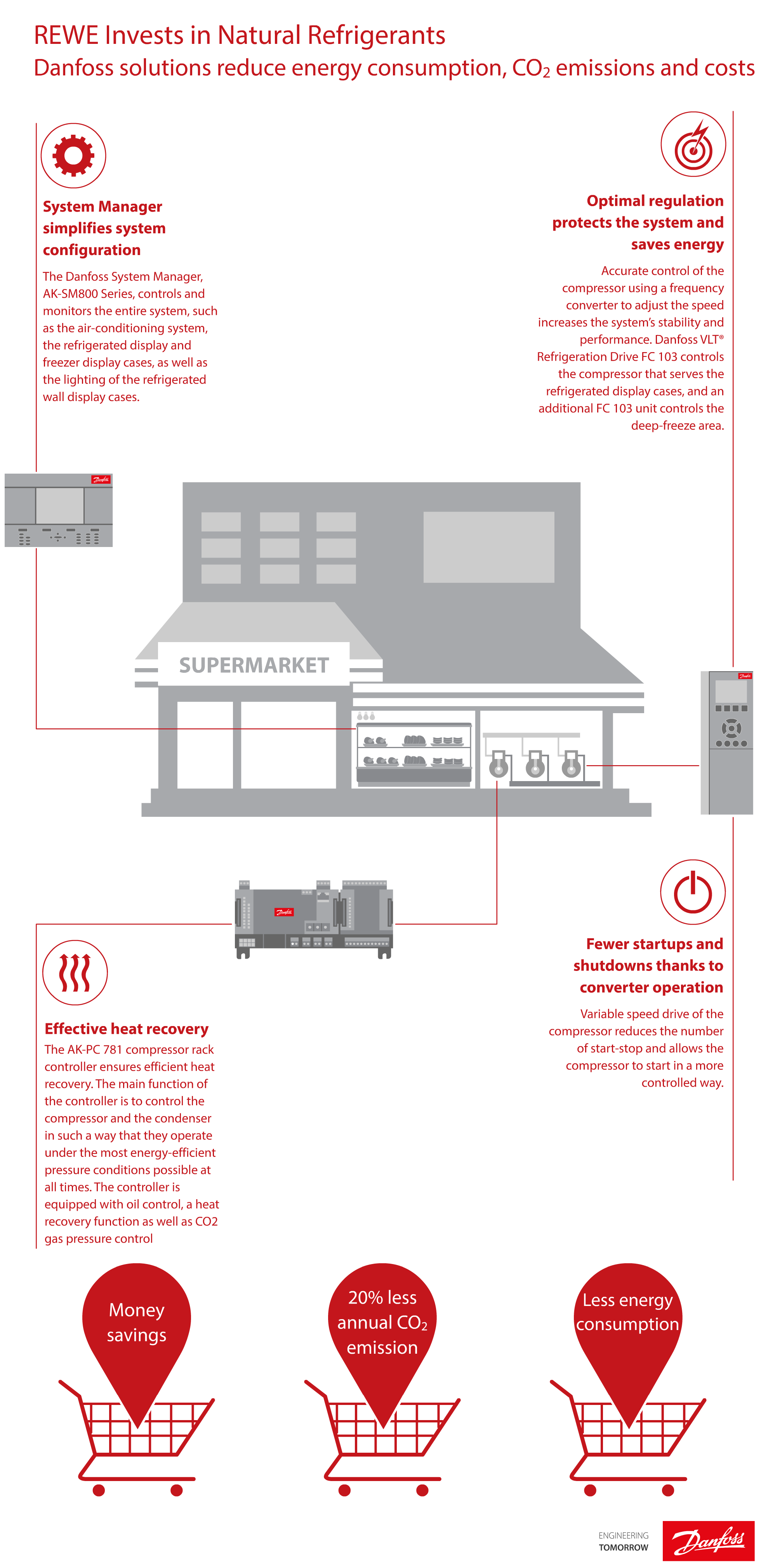Die Anlage versorgt die Kühlvitrinen und -schränke, die Tiefkühler, das Heizsystem, das Warmwassersystem und die Klimaanlage für die Verkaufsfläche. Das Gestaltungskonzept ist deutschlandweit das erste seiner Art. Tatsächlich sind derzeit nur vier solche Anlagen weltweit installiert. Schrezenmaier Kältetechnik setzte das Konzept um und installierte dazu eine CO2-Kälteanlage mit Komponenten von Danfoss.