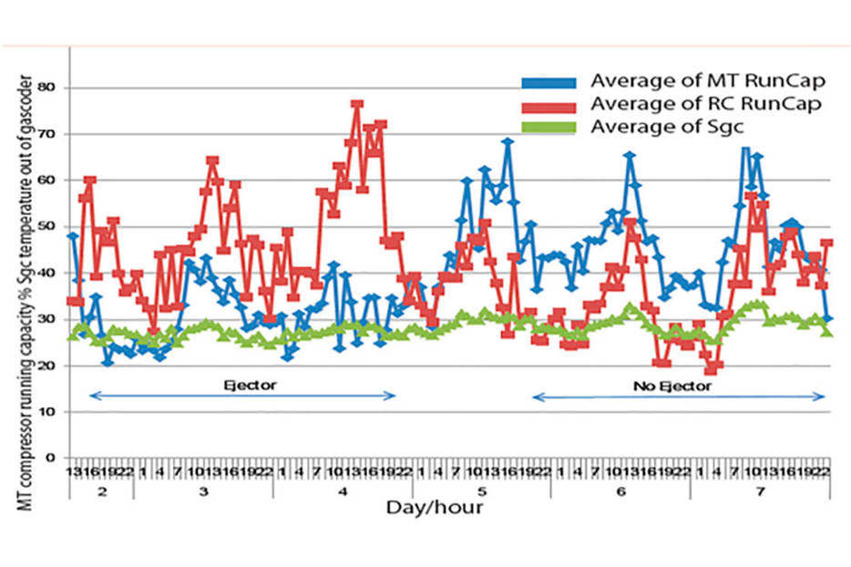 In the case of the supermarket in Africa, the documented efficiency of the Ejector reached 30%. When the Ejector is running, the receiver compressors take over the main part of the work, whereas when the Ejector is off, the MT compressors are dominant.