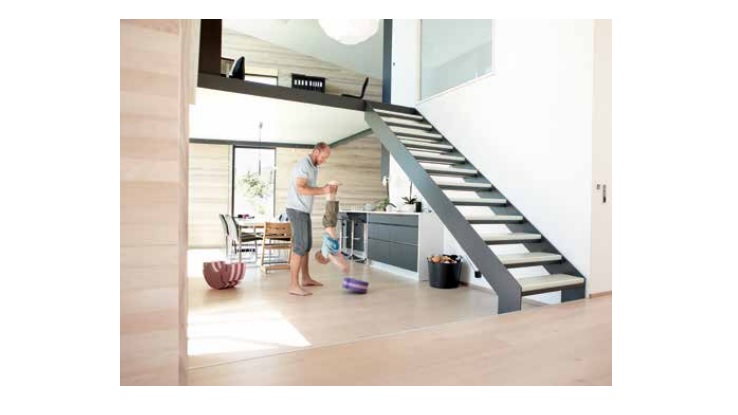 “In-floor heating provides comfortable heat that is quick and easy to adjust individually for each room. We simply set the system to the desired temperature, and a thermostat in each room automatically adjusts the temperature. The system also reacts quickly to changes in temperature so we avoid excess temperatures when the sun hits the large, south-facing windows, which means that we don’t use unnecessary energy for heating, but take optimal advantage of the free heat from the sun,” says Maria Styrbæk, who lives in the house with her husband and two small children.