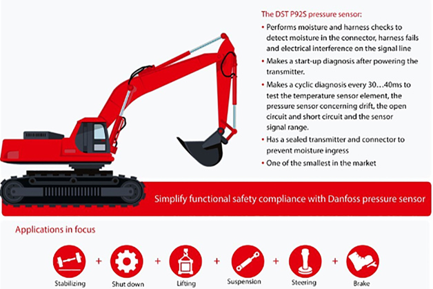 The new Danfoss pressure sensor DST P92S demonstrates a smart solution to the functional safety requirements in heavy-duty, off-road applications, such as for instance: