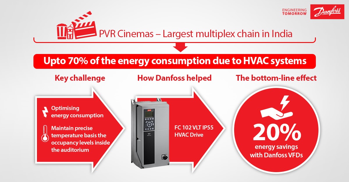 Danfoss being the pioneers in HVAC technologies globally, was the ideal partner PVR looked upon to serve this purpose. Driven by a promise to engineer a better tomorrow, Danfoss Variable Frequency Drives (VFDs) were the perfect answer to PVR’s challenges. Danfoss’ plug-and-play and energy efficient FC-102 VFDs proved to be the best solution for HVAC systems across PVR’s multiplexes in India, and have delivered unprecedented results for the service provider.