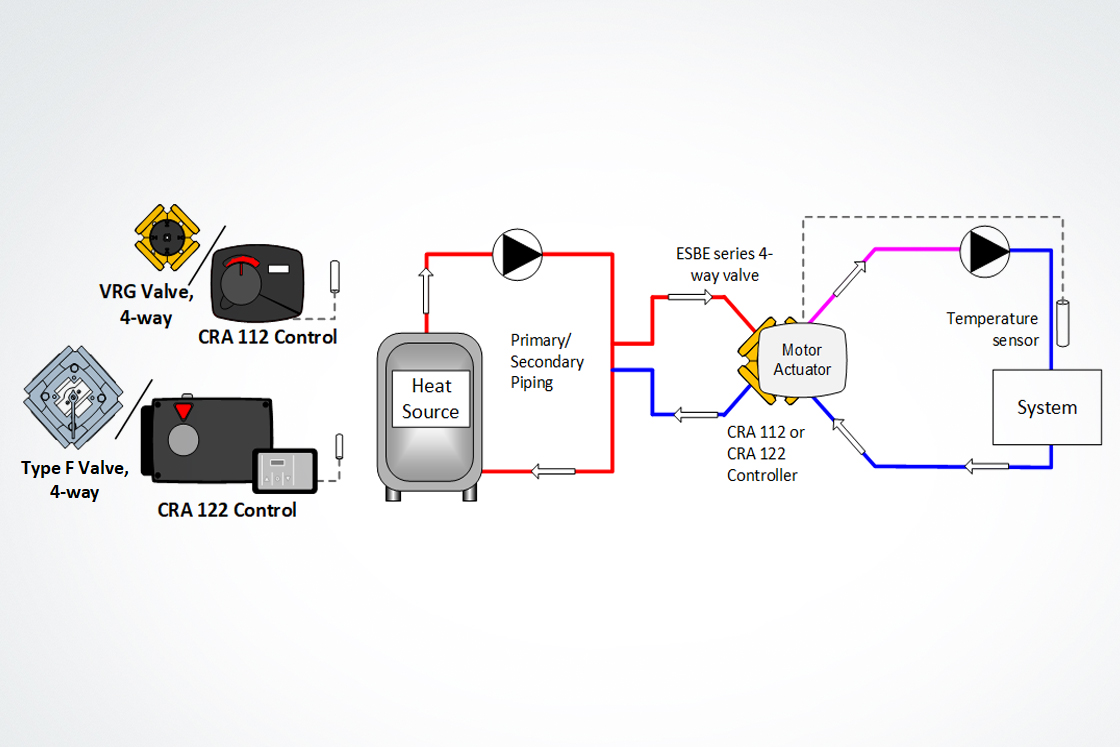 The ESBE CRA Series of setpoint controls includes a combined motorized actuator and constant flow temperature control with an adjustable temperature setting.