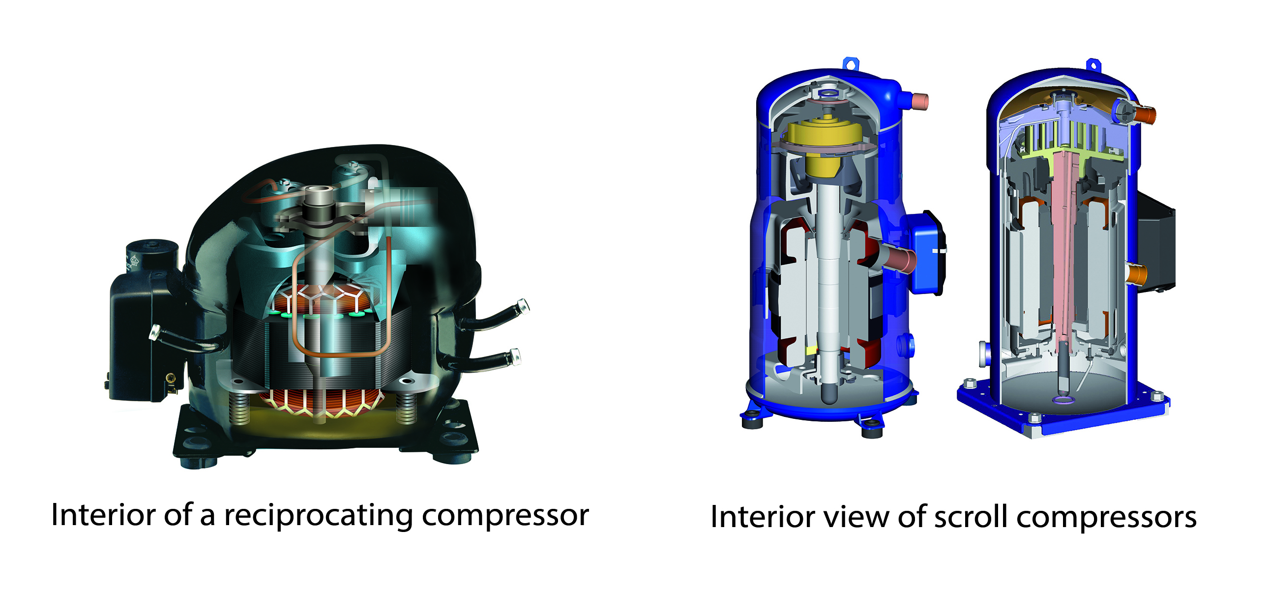 There are several kinds of refrigeration compressors available, though most walk-ins use either a reciprocating or scroll compressor. For smaller walk-ins, a small reciprocating compressor with a capacity of up to 1 horsepower (hp) is usually recommended while scroll compressors are a better fit for larger cold rooms as their capacities start at about 1 hp. Scroll compressors have fewer moving parts than reciprocating compressors, which results in fewer opportunities for break downs and a long-lived, reliable unit. Scroll compressors are also incredibly energy efficient, with some models showing 35% lower energy consumption compared to reciprocating compressors under laboratory conditions.