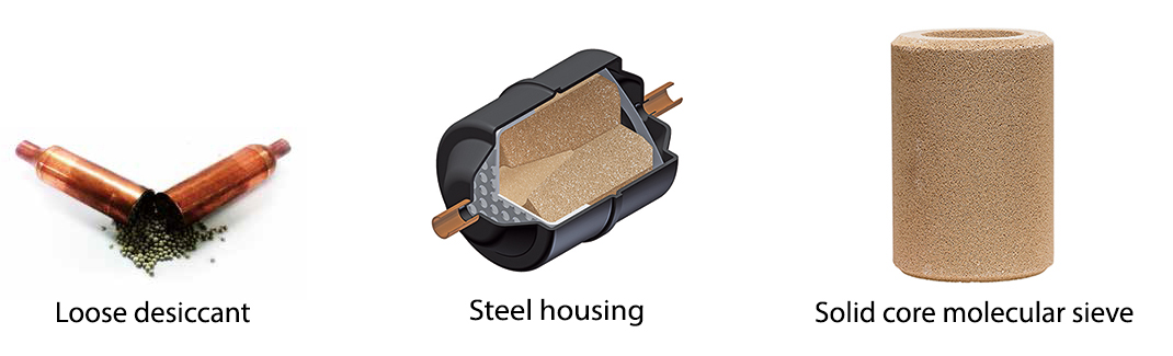 As their name suggests, filter driers absorb moisture and filter debris. Two of the more widespread filter drier technologies are loose desiccant with spun copper tubing and solid core molecular sieve with steel housing, though these two types provide very different kinds of protection against moisture, acid, and debris. Spun copper filter driers use loose desiccant beads enclosed in a thin copper casing tube and with a built-in wire mesh or fiberglass mat for solid particulate filtration, while solid core filter driers use an integrated process when the refrigerant passes through molecular sieve material and polyester felt mats.