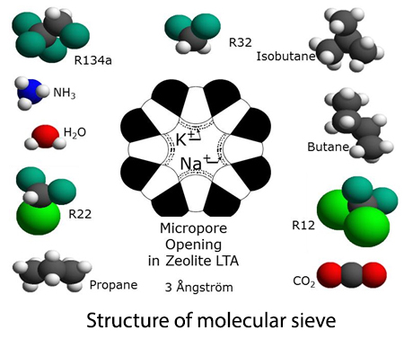 Spun copper technology uses small beads coated with a binder necessary to prevent the beads from disintegrating during daily operation. As a result, this coating slows down the moisture adsorption rate and makes the filter less efficient. Conversely, the solid core filter drier consists of a molecular sieve which retains the highest amount of water possible due to the strong bond between the molecular sieve and the water. The solid core selectively sorts molecules primarily based on a size exclusion and polarity process due to a dimensionally consistent molecular pore structure: the micro-pore opening is large enough for water molecules to enter, but not refrigerant molecules, meaning that water gets trapped by the sieve, while refrigerant passes through.