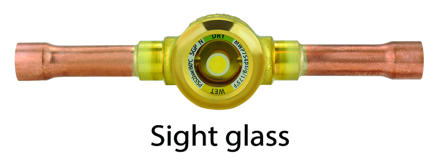 The sight glasses should be installed directly after the filter drier, ensuring that the filter drier is functioning properly. Refrigerant flows normally through the sight glass, which contains a small, glass-covered chamber. Here, there is an easy-to-see indicator that changes color when moisture levels build up too high and threaten the health of the system. Due to the glass cover, it is possible to see the refrigerant as it flows through the system, providing an opportunity to watch for bubbles.