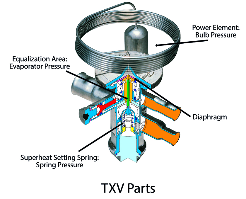 The basic parts of a TXV are the sensing bulb, the diaphragm, the equalization area, and the superheat setting spring, which work against each other to control the valves operation. First, the sensing bulb, which is filled with a special, fluid corresponding to the specific refrigerant used, is mounted on the suction pipe on the downstream side of the evaporator; as the temperature of refrigerant rises, it causes the sensing bulb fluid to expand driving the diaphragm down. Next, the superheat setting spring pushes back, creating constant pressure. Finally, the evaporator pressure in the equalization area varies according to different operating conditions such as refrigerant temperature, ambient temperature, and bulb and spring pressures. Based on the balance created by these three pressures, the valve will open or close and ensuring that a stable superheat is maintained even when there are varying ambient conditions.