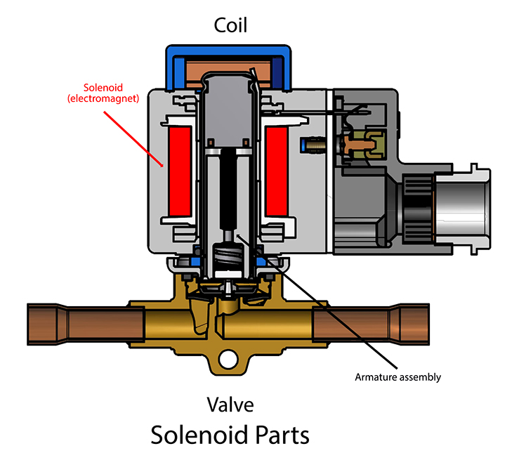 Solenoid valves are a style of regulating valve which use electromagnets to open or close. Valves come either normally open (NO) or normally closed (NC), depending on the needs of the system. Each solenoid is equipped with a coil containing the electromagnet, which controls an internal armature assembly. For example, in a NO solenoid, when the valve is activated, it drives the armature assembly down, closing the valve.