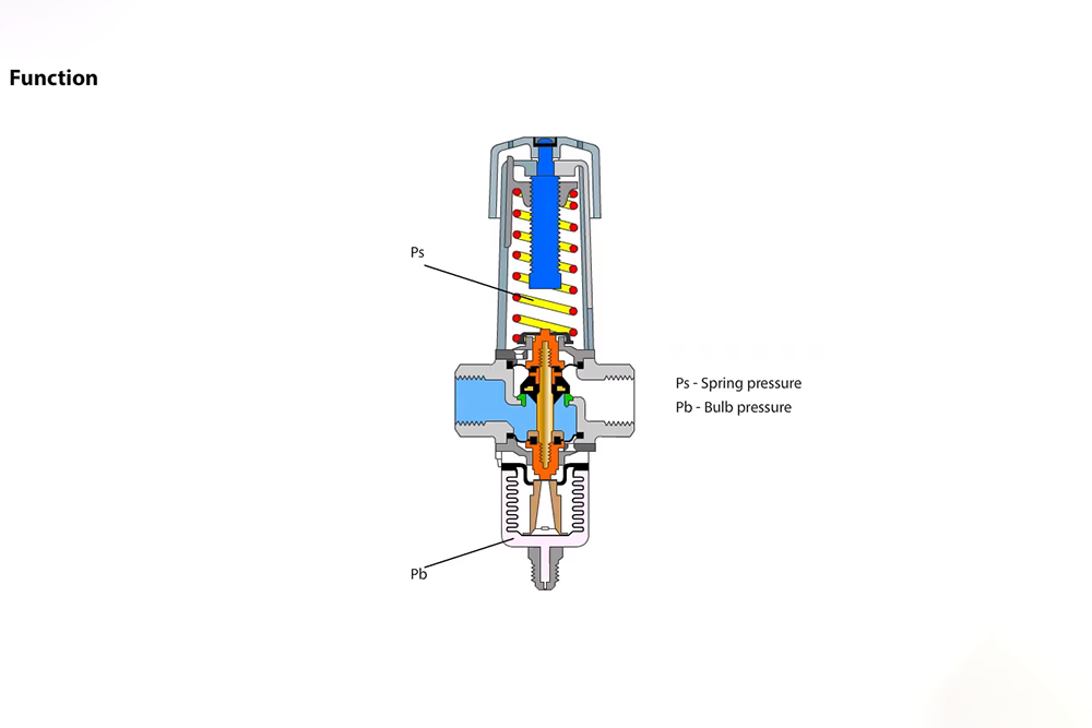 Brass bodied valve with stainless steel power element, capillary tube and sensing bulb. Equipped with flare connections and interchangeable orifices.