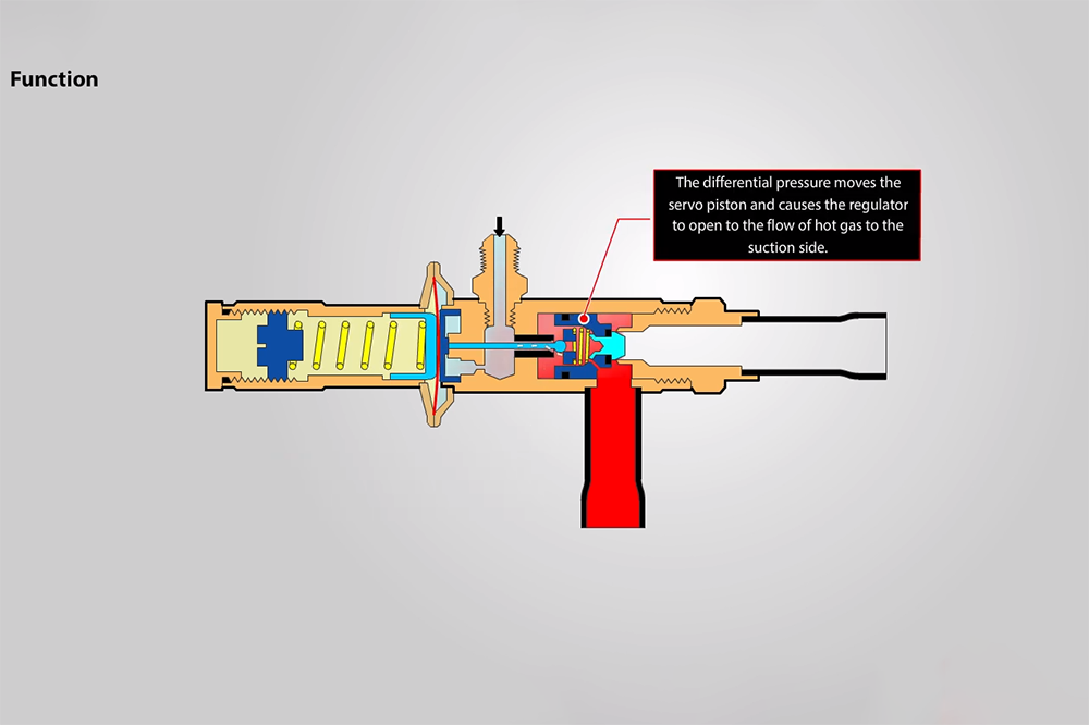 Hot gas bypass regulator to adapt evaporator load to compressor capacity.