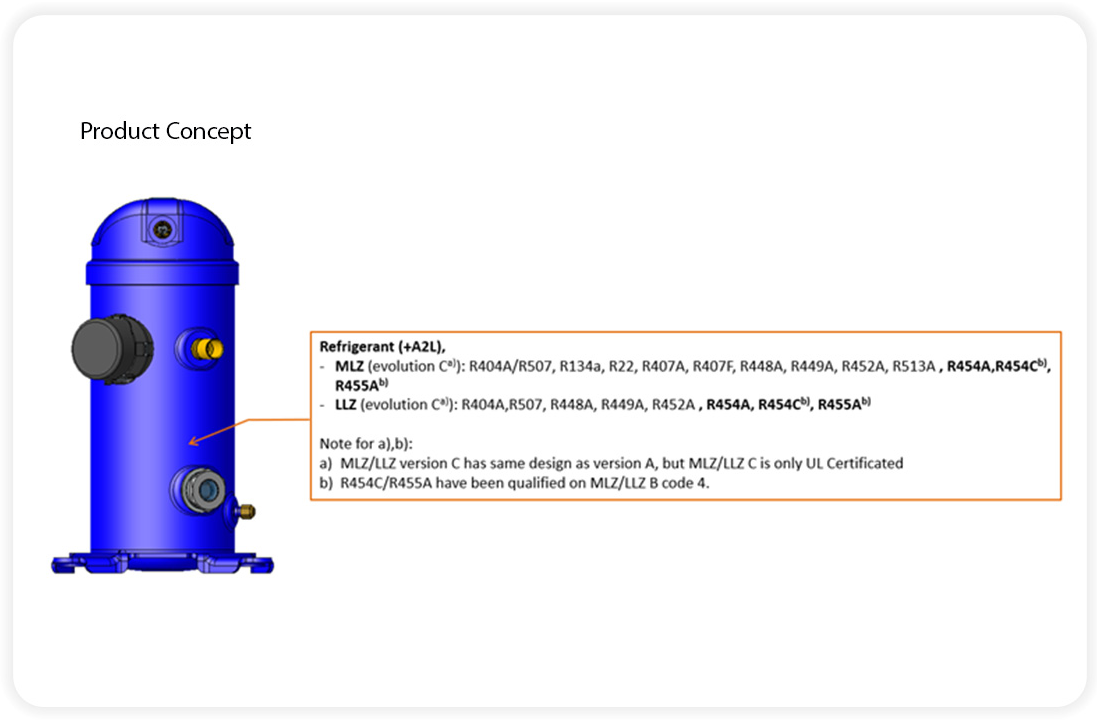Since 2023, We have released MLZ/LLZ version B models filled with POE oil RL46HB(215Z) approved with new A2L refrigerants R454C and R455C, which is also allowed with A1 low-GWP refrigerants R448A,R449A,R134a, R513 and so on. Now, new models MLZ/LLZ (motor code 1& code 2) version C (UL only) with refrigerant R454A, R455A, R455C have been released in June 2025.