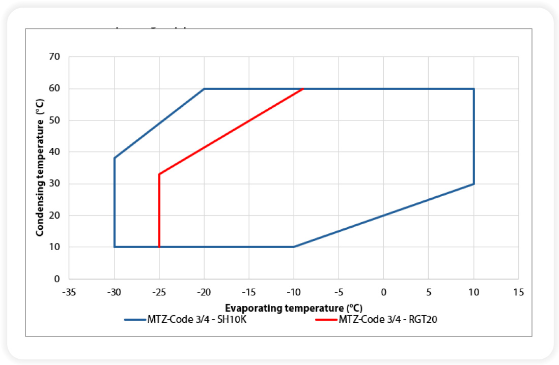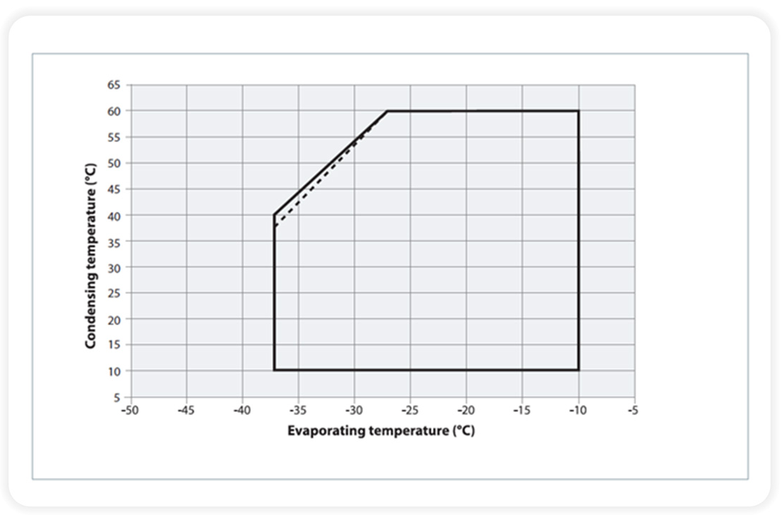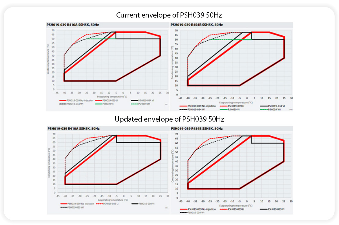 Starting from last October, the 50Hz VI envelope of the PSH039A4ELA/FLA had been released with a maximum condensing temperature of 60 °C, compared to other PSH models at 68 °C . We are pleased to announce that after developing a new overload protector, the envelope can now match the area of other models, efective from August 2025.