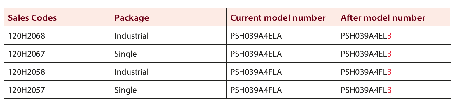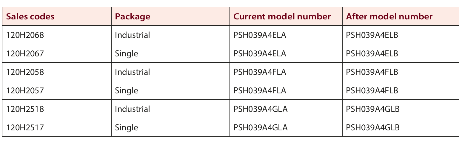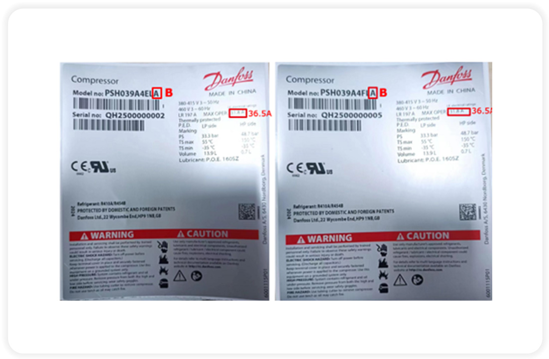 Shares the same motor and protector update as PSH039A4ELA/FLA, changing model name to PSH039A4GLB and RLA updated to 30.7A. The technical model’s name on nameplate will be updated accordingly. With no impact on the envelope and other parameters.