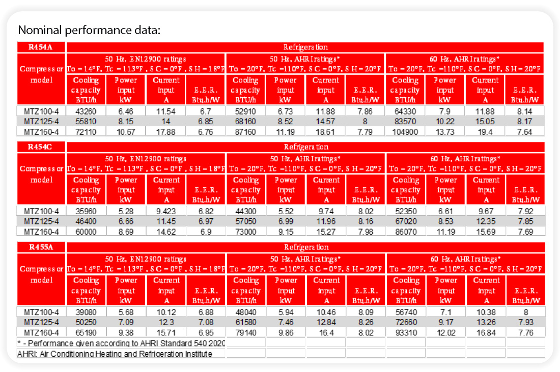 We are excited to announce an important update regarding our MTZ compressor models. These models are now approved for use with the refrigerants R454A/C and R455A, which can replace R404A and R507 in their applications.
