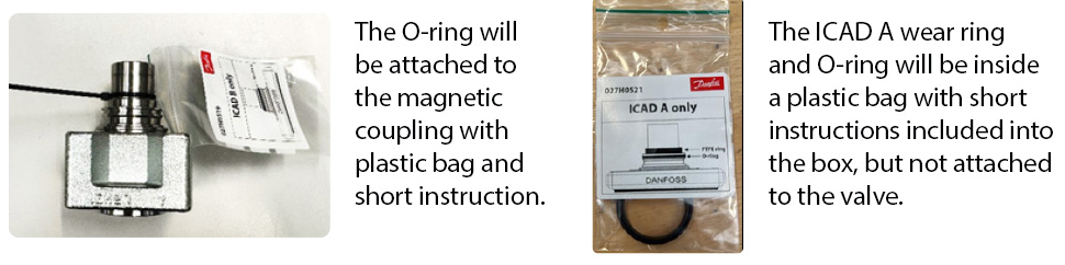 Fully assembled valves will be delivered only with new ICAD B O-ring. The O-ring will be attached to the magnetic coupling with plastic bag and short instructions (please see the photo below). This is done due to risk of the O-ring falling off y transportation.