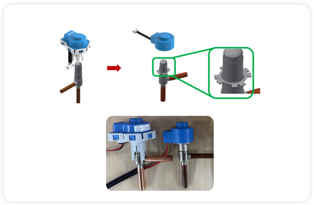 The valve is adjusted with an additional fixing ing outside of the rotor tube to clip the coil. Inner valve design and performance are unchanged.