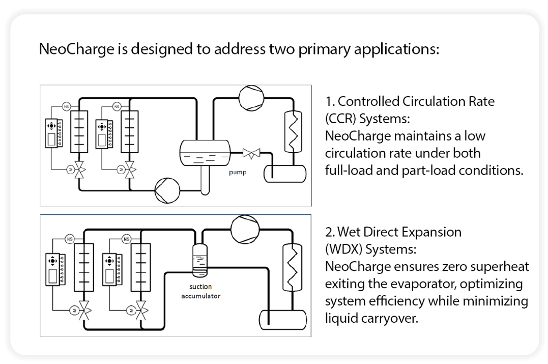 We are pleased to announce the release of the groundbreaking Danfoss NeoCharge Solution designed for and tailored to the needs of industrial refrigeration. NeoCharge is a simple, unique technology that reduces the system charge by controlling the refrigerant injection into the evaporator keeping high performance.