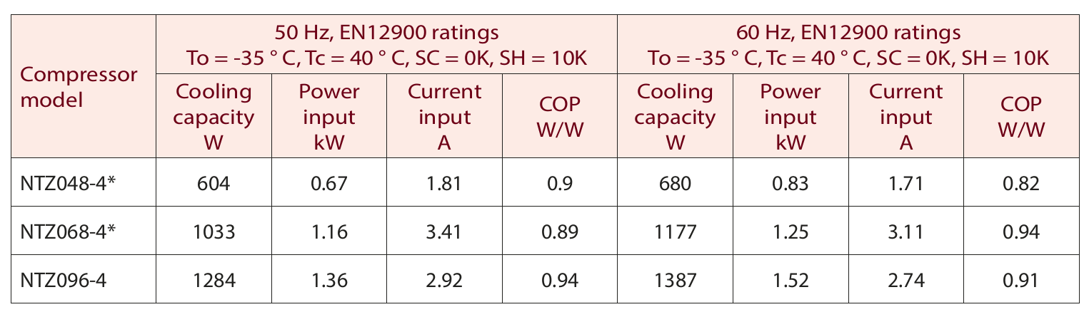 We are pleased to announce that the NTZ096 model, motor code 4 (refer to models listed below), is now approved for use with R454C refrigerant. R454C can be used as a replacement for R404A and R507 in various applications. Please refer to the operating map for specific usage guideline.