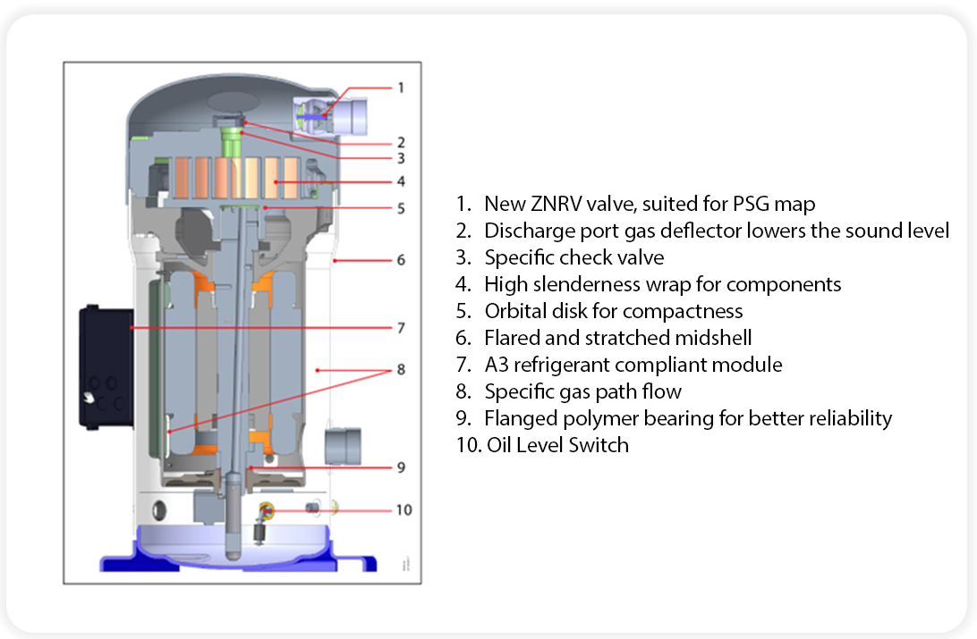 Additionally, a new generation of Oil Level Switch is integrated directly into the compressor, mitigating reliabilityrisks associated with temporary oil shortages.