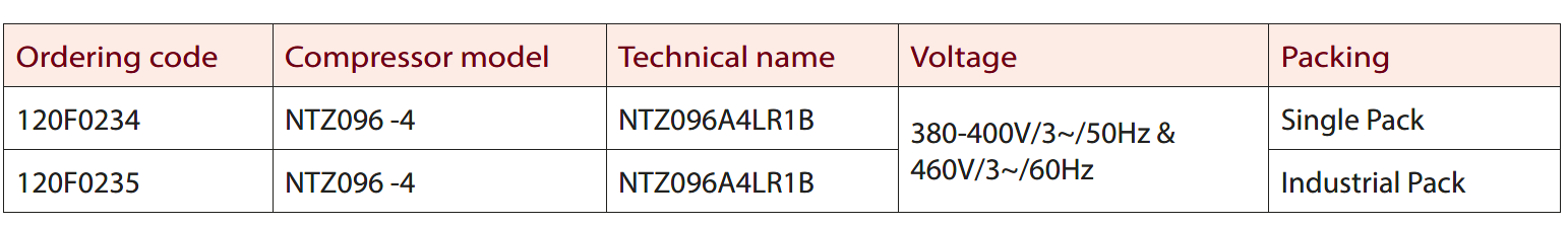 This change is efective from July 2025. All NTZ096-4 compressors, starting with serial number 1009503203, efective July 9th 2025, are qualified with R454Crespecting operating map presented on the next page.