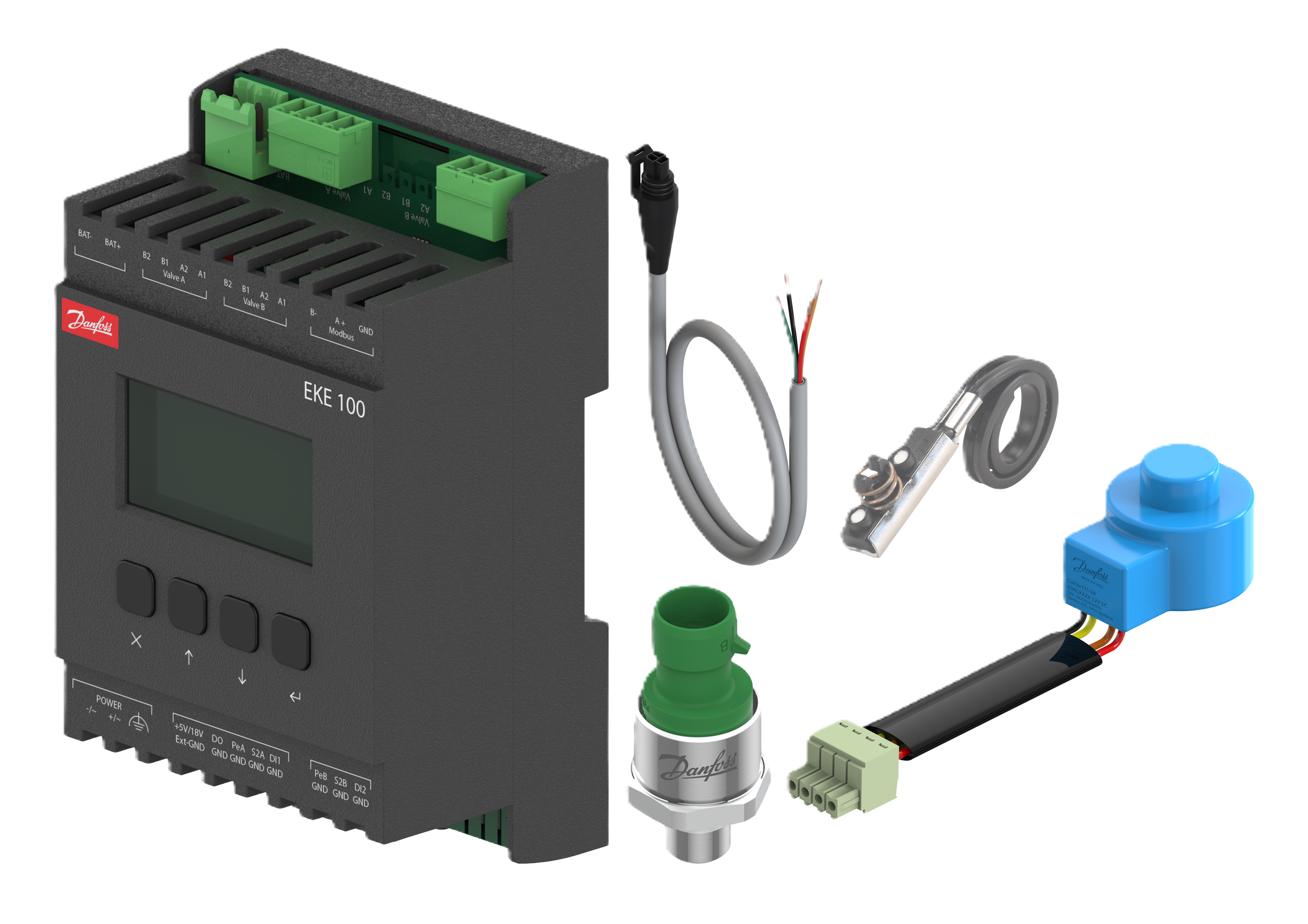 The kit includes a stepper motor electronic expansion and superheat controller (EKE 100 1V), a pressure transmitter (DST P110), and a temperature sensor (AKS PT1000), all selected to ensure compatibility and optimal performance.