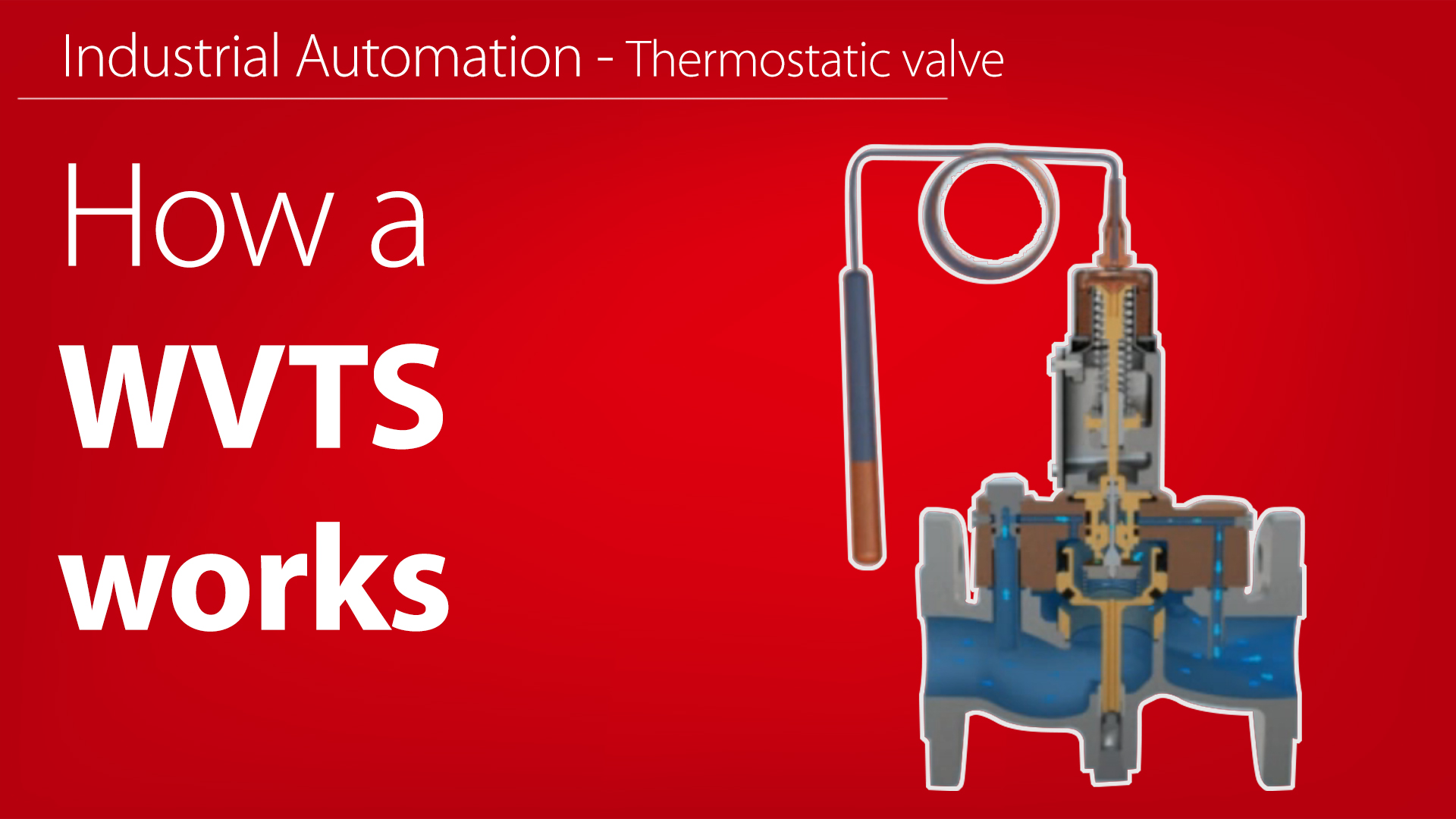 The WVTS is an indirect servo-operated thermostatic valve. It's ideal for controlling temperature in industrial applications, by regulating the flow of cooling water or neutral brine. This animation shows how the valve opens when the temperature rises, without an auxiliary power supply.