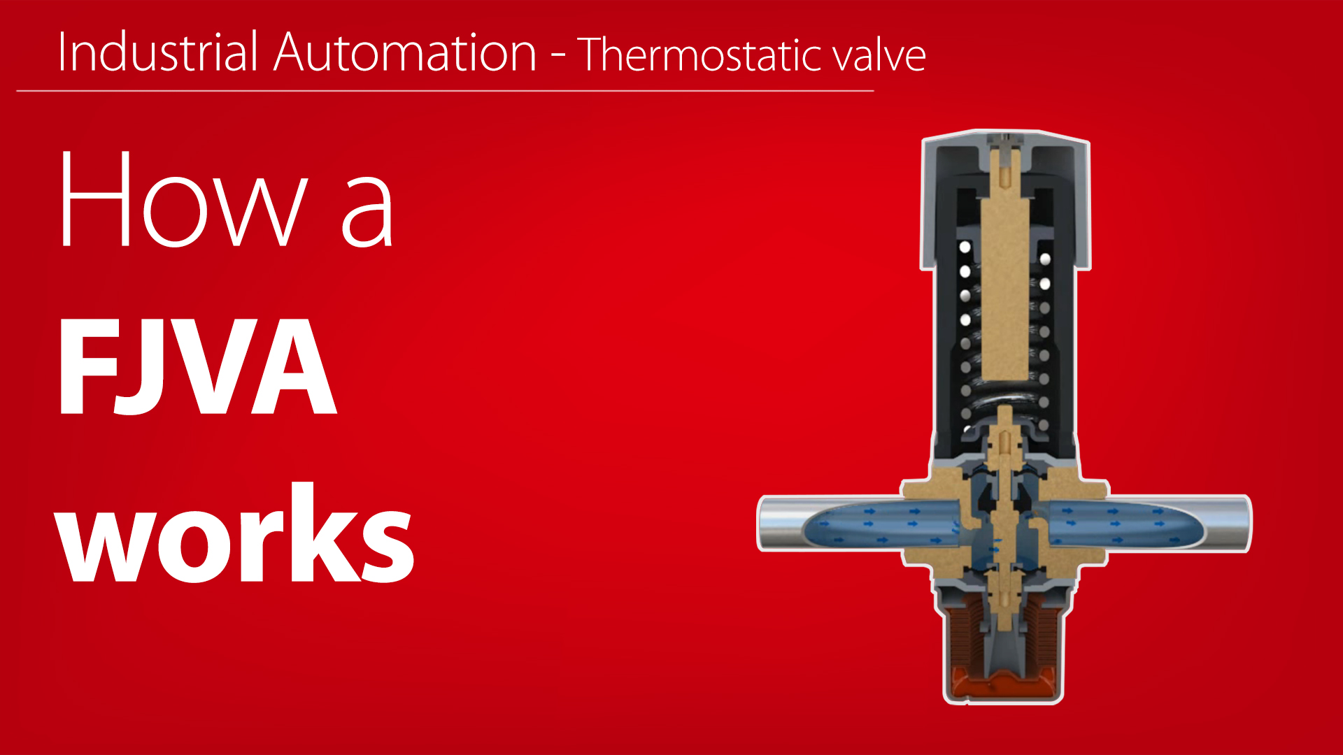 The FJVA is a self-regulating thermostatic water valve designed for flow regulation in heating and cooling systems. This short animation shows how the valve responds to temperature changes without the need for power or compressed air.