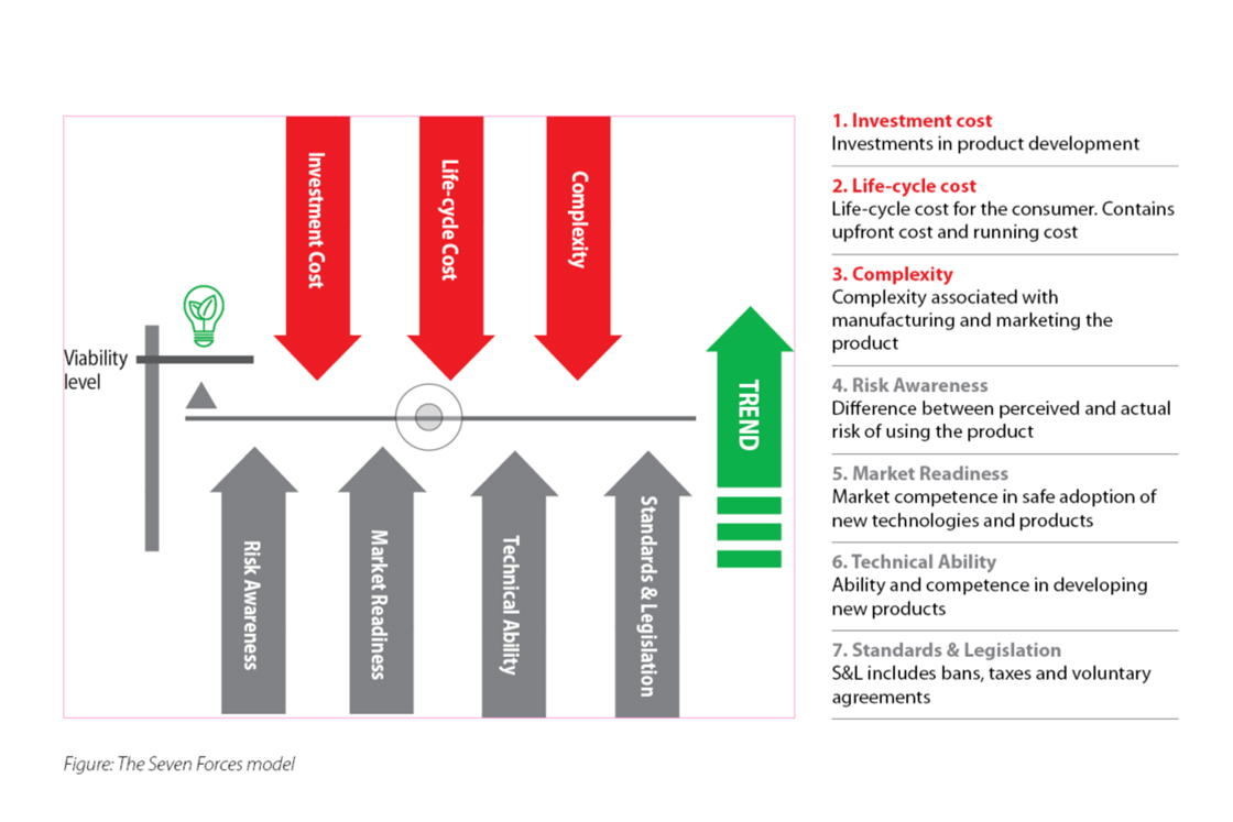 We call this the 7 Force Model. The red arrows refer to economic factors and the grey arrows are cultural factors such as knowledge, education, and legislation. When the balance between the red and grey forces reach the viability level, it becomes much more likely that the industry will start investing in new solutions and technologies. When investing in new technologies and building up competencies, legislation and derived standardization are the major drivers.