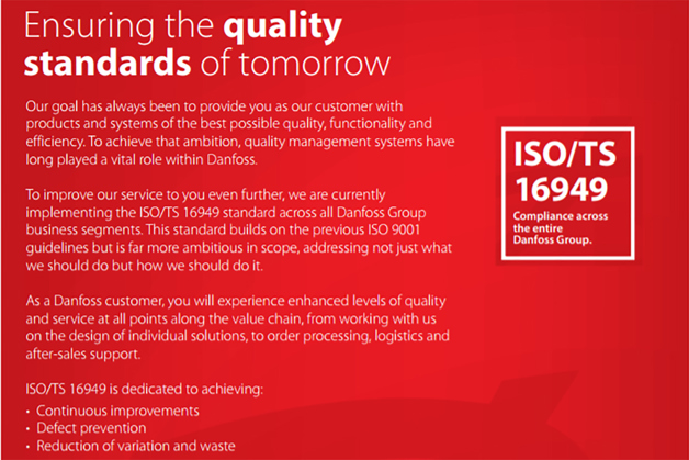Our goal has always been to provide you as our customer with products and systems of the best possible quality, functionality and efficiency. To achieve that ambition, quality management systems have long played a vital role within Danfoss. To improve our service even further, we have implemented the ISO/TS 16949 standard across all the Danfoss Group business segments.