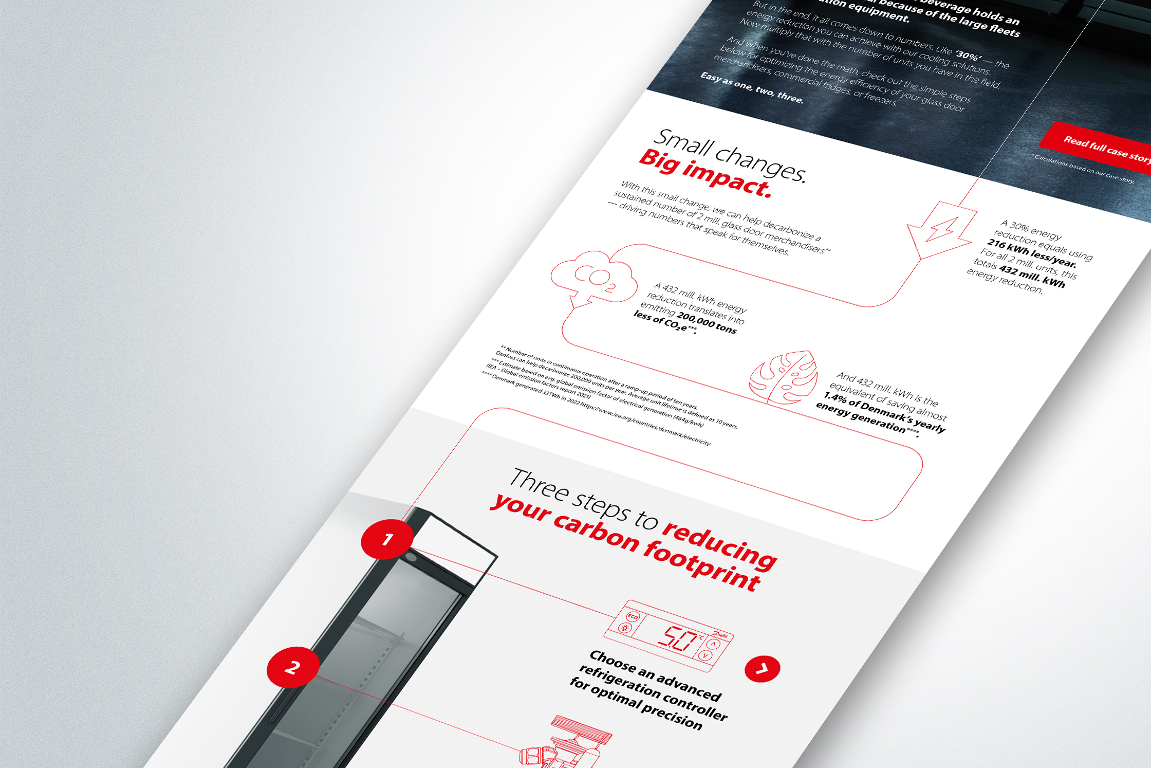 Consider these numbers: the 30% energy reduction we achieved with our redesigned bottle cooler equals using 216kWh less/year. Danfoss can help decarbonize a sustained number of 2 mill. glass door merchandisers* totaling an energy reduction of 432 mill. kWh. This translates into emitting 200,000 tons less of CO₂e** — the equivalent of saving almost 1.4% of Denmark’s yearly energy generation***. Read that again.