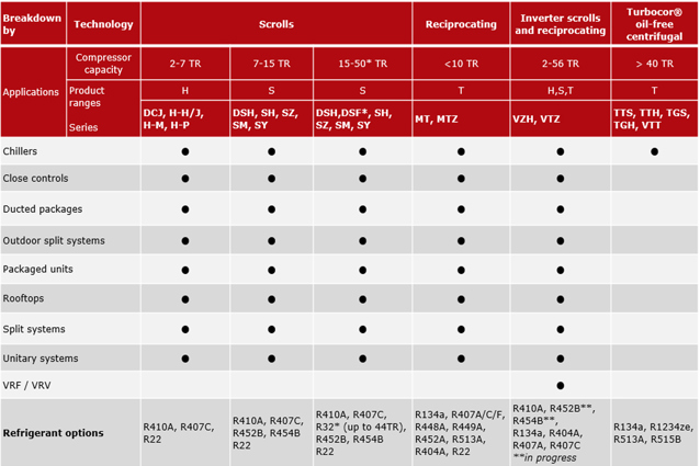 The widest compressor range from 3 to 450 TR with scroll and Turbocor oil-free technologies
