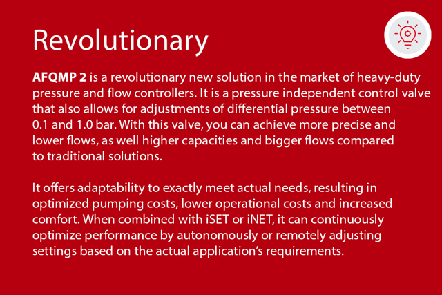 ​Simply and remotely increase the control ratio up to 300:1. The optional upgrade with intelligent solutions iSET or iNET, allows for remote adjustments to pressure settings. This increases the control ratio, also known as range-ability. By setting the pressure to the maximum value, the maximum flow can be increased, while lowering the pressure setting to the minimum value decreases the minimum flow. By adding the dynamic AMEi 6 actuator with iSET or iNET functionality, the range-ability can be increased up to 300:1.