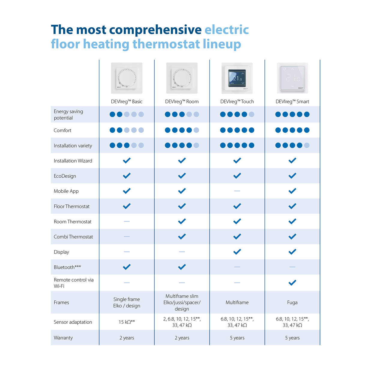 Comparative table of DEVIregTM thermostats for indoor