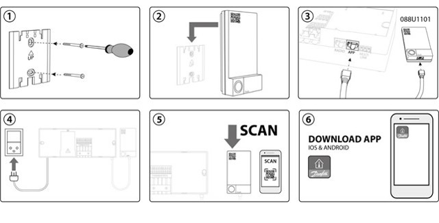 Simply follow the first 4 steps below. Once the Icon App Module 088U1101 is installed, the user can scan the QR code on the Icon App Module to download the Icon App (step 5 & 6 below) or search for “Danfoss Icon” in the App Store or Google Play.