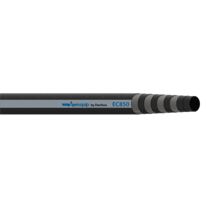 Aeroquip EC850 Dynamax four/six wire spiral hoseIntroducing the EC850 spiral hose, your ultimate solution for high-pressure demands. Engineered for the latest pump technologies, it undergoes rigorous testing up to 500 bar, boasting an exceptional 3 million impulse cycles in sizes -10 and -12—six times longer than the industry standard. With a burst pressure of 2,000 bar and 19% better bend radius, it offers superior performance and 8X higher abrasion resistance with Danfoss Dura-Tuff® cover. Compatible with Danfoss Global non-skive one-piece 1W fittings, this hose takes hydraulic systems to new heights, ideal for high-pressure applications, offering extended machine uptime and simplified assembly, all with better sealing and leak-free operations.