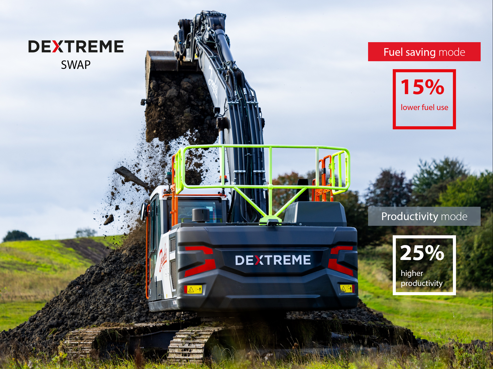 Dextreme SWAP offers software configurable excavator working modes – switchable at a fingertip. The fast response of the Digital Displacement® pump allows for optimal torque control of the engine.