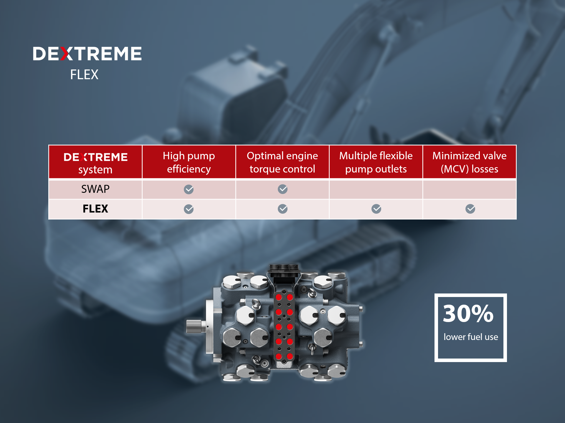 With Dextreme systems, the excavator hydraulics is powered with a Digital Displacement® pump, which reduces losses in different system components.