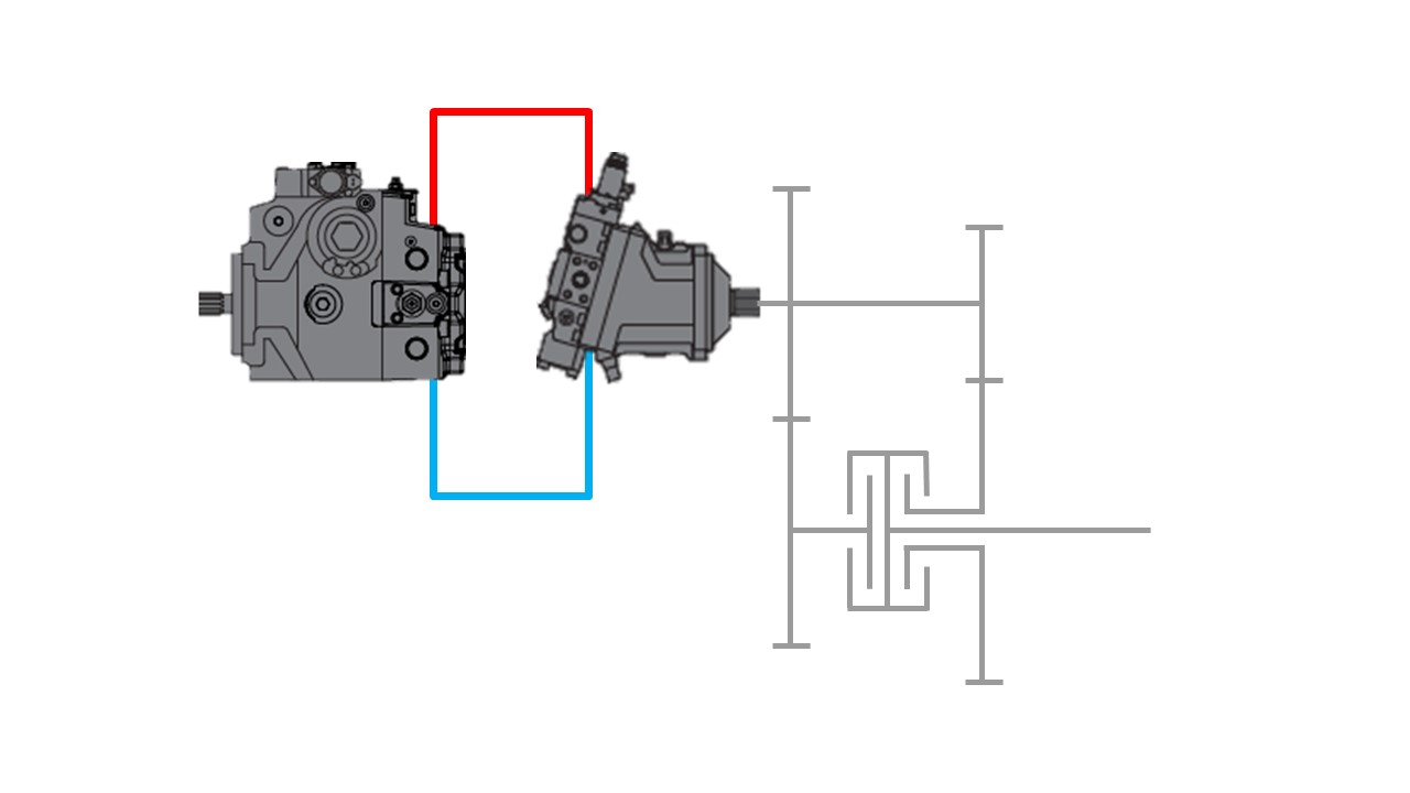 One-pump, two-motor system with a torque summation gear box. Ideal for high corner power applications, such as wheel loaders and large forestry machines.