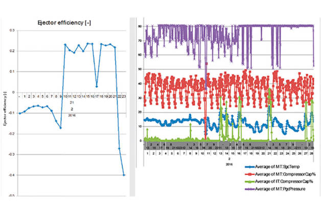 In the case of the supermarket in Africa, the documented efficiency of the Ejector reached 30%. When the Ejector is running, the receiver compressors take over the main part of the work, whereas when the Ejector is off, the MT compressors are dominant.