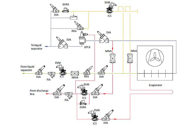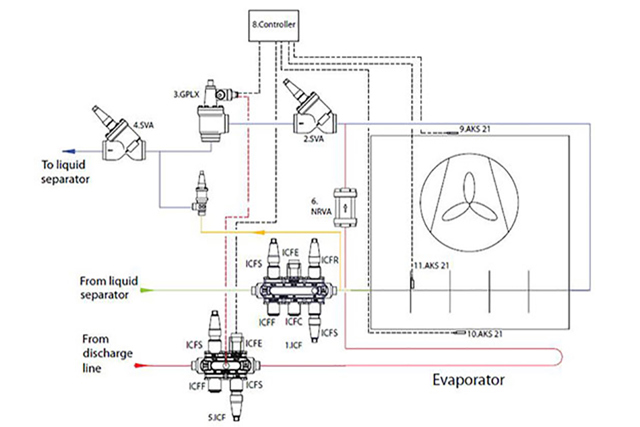Fig. 1 presents a typical industrial refrigeration evaporator with hot gas defrost. Control valves for the evaporator could be divided in the 4 main groups: