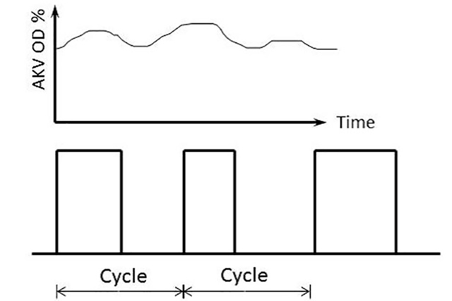 Liquid feed line has the minimal influence on the hot gas defrost process. What could be important to consider here, is the amount of liquid that is fed to the evaporator. In case PWM (pulse width modulation) strategy is used, the amount of liquid refrigerant in the evaporator will be lower. That should reduce the time needed to get rid of the liquid refrigerant. It could also be expected that the amount of ice is lower as well, as the temperature deviation on the surface in on/off periods is lower (figure 2).