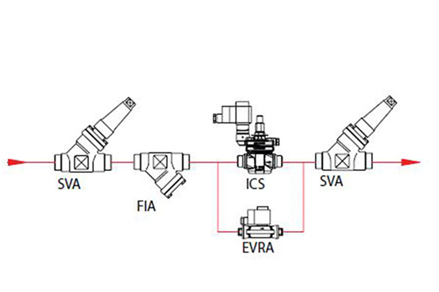 2. Hot gas feed line. Traditionally it has a stop valve, a filter, another solenoid valve and a stop valve