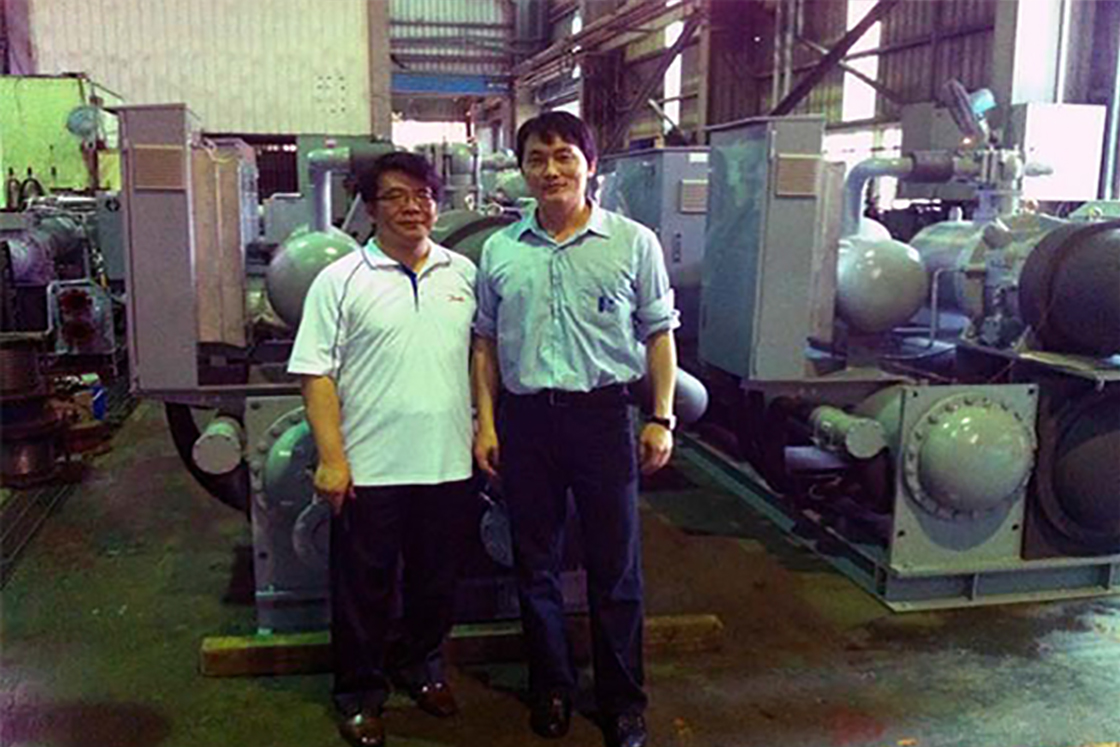 Danfoss Sales Manager Mr. Sam Tsai and Kuen-Ling Deputy Manager Mr. Dennis Fang in front of Kuen-Ling's 250RT chiller ready to be exported to Hong Kong
