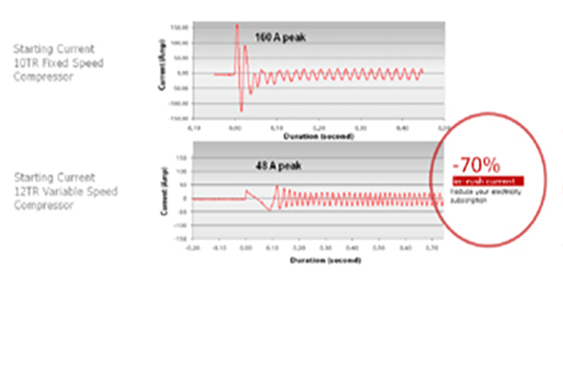 Reliability is a keyword when it comes to infrastructures of IT operations. The power supply may be interrupted, and therefore there are always backup generators in order to tackle these incidents. Soft starter function is integrated into the inverter system which reduces the demand on the power grid and backup generators. Danfoss inverter compressors have an in-rush current near zero - that's 70% of in-rush current reduction.