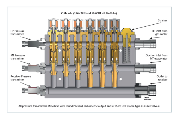All ejectors in the Danfoss portfolio have a high-pressure inlet (high-pressure CO2 gas from the gas cooler), a suction inlet (from MT evaporators or suction accumulator), and an outlet for returning the gas or liquid to the receiver. The coils activating the individual ejectors are available from 110 to 230 V, 50 and 60 Hz. The Multi Ejector HP and LP ejectors is delivered with three pressure transmitters, used for pressure control in the AK-PC 782A pack controller. The Multi Ejector is available in different versions, depending on the application. Each block has a variable number of ejectors of different sizes mounted vertically.