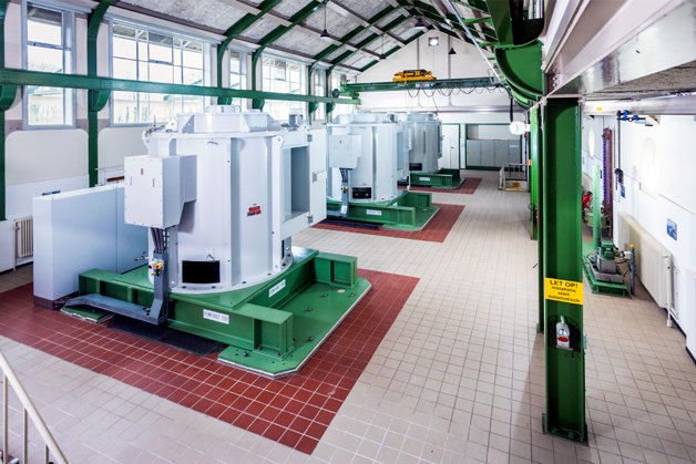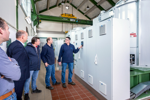 The 28-pole motors run at approximately 23 Hz, which corresponds to 98 rpm. They are started with no load. When the pressure in the pump reaches a specific level, the outlet valve is opened and the station starts to discharge water. Thanks to the speed control and the sturdy design of the pump and motor, the noise level is surprisingly low, even in full operation. It’s possible to conduct a normal conversation standing right next to the huge motor.