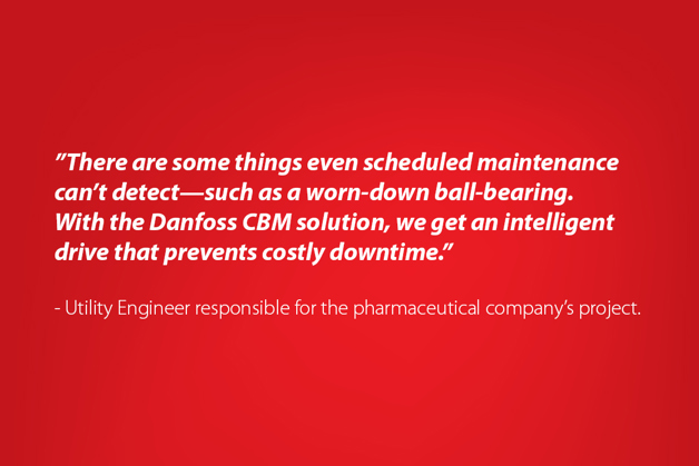 Danfoss proposed the VLT® HVAC Drive FC 102 with integrated condition-based monitoring (CBM) for the pharmaceutical company’s HVAC system. A CBM solution empowers the drive to act as a smart sensor, monitoring the condition of a motor and application for early detection of potential problems—such as mechanical vibration inside an AHU. That means the intelligent drive not only produces data—it interprets data into actionable insights for preventative maintenance.